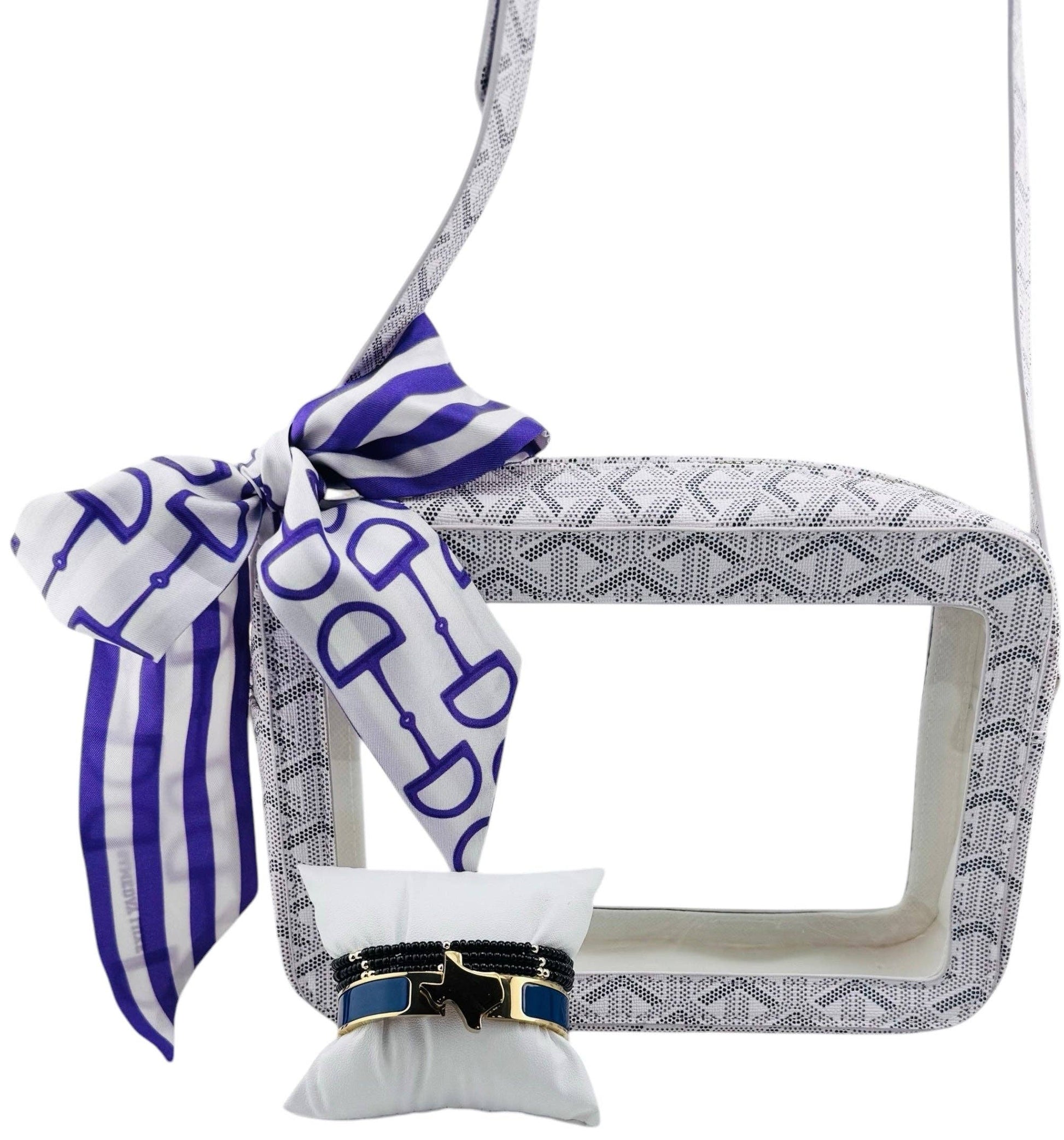 Add a little something extra to your Clear bag with one of our Twillys. Made of 100% silk, this custom fabric twilly is sure to elevate your gameday look. One side is printed with an iconic horsebit print while the opposite side has a complimentary classic stripe print. Tie it around the handle of your bag, wear it in your hair, or tie it onto your boots! 32 Inches x 2 Inches